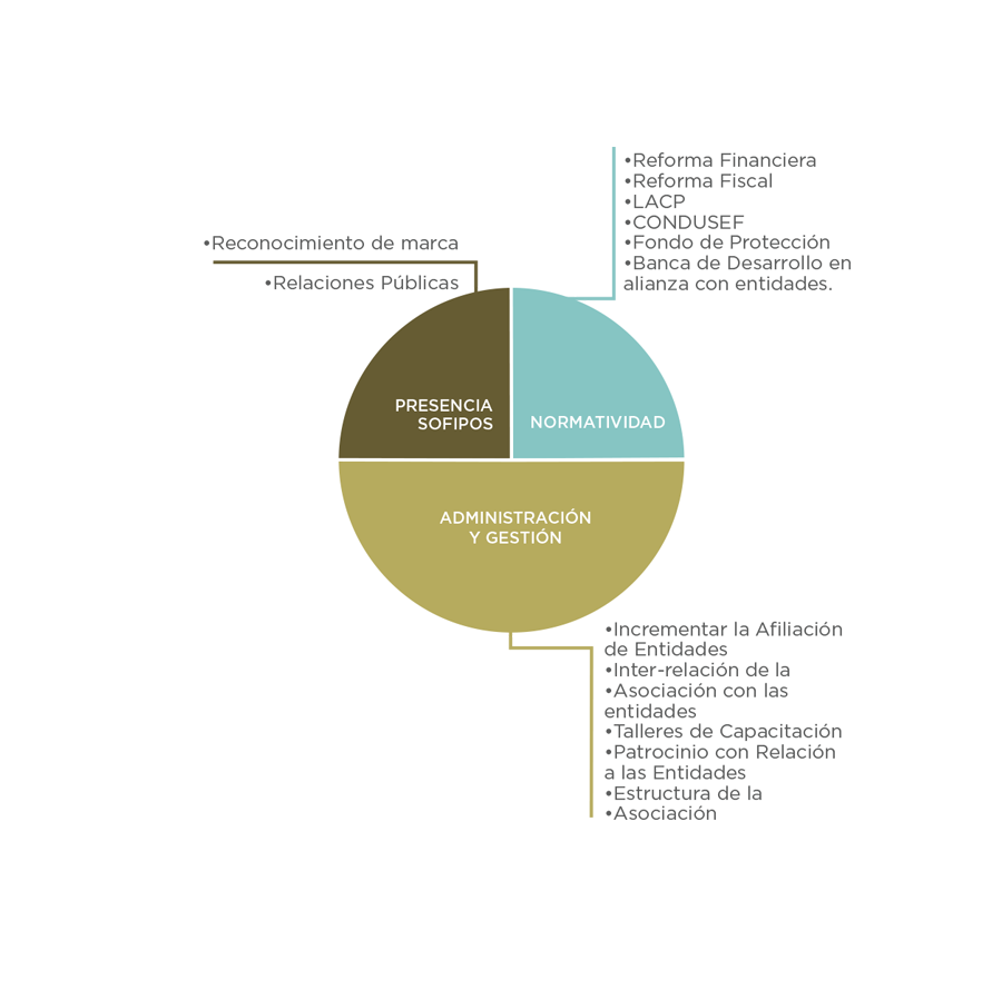 LÍNEAS ESTRATÉGICAS El plan de trabajo 2014, autorizado por la Asamblea de Afiliados incluyó los siguientes objetivos estratégicos: 1. Ampliar y fortalecer la visibilidad y presencia de las SOFIPOS. 2. Impulsar y promover la construcción de Políticas Públicas y una regulación acorde al sector. 3. Fortalecer la Administración, Representatividad y Gobernanza de AMSOFIPO. 4. Fortalecimiento operativo de las SOFIPOS.